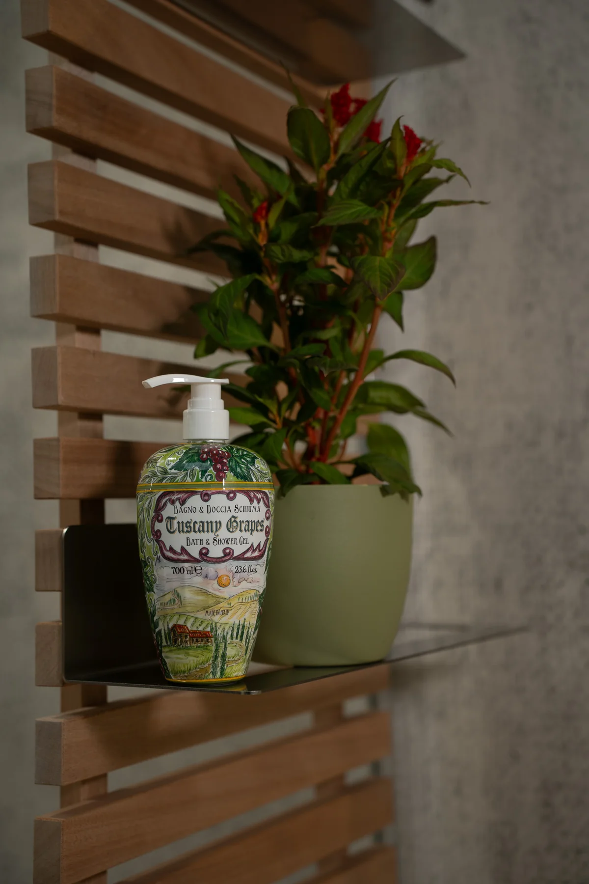 Pasinerk į atpalaiduojantį ritualą su dušo gelis Chianti vynuogės – išskirtine formule, kuri švelniai valo ir drėkina odą. Jos aromatas nukelia į Toskanos kalvas, kur saulėje noksta vynuogės, skleidžiančios saldų ir vaisinį kvapą.