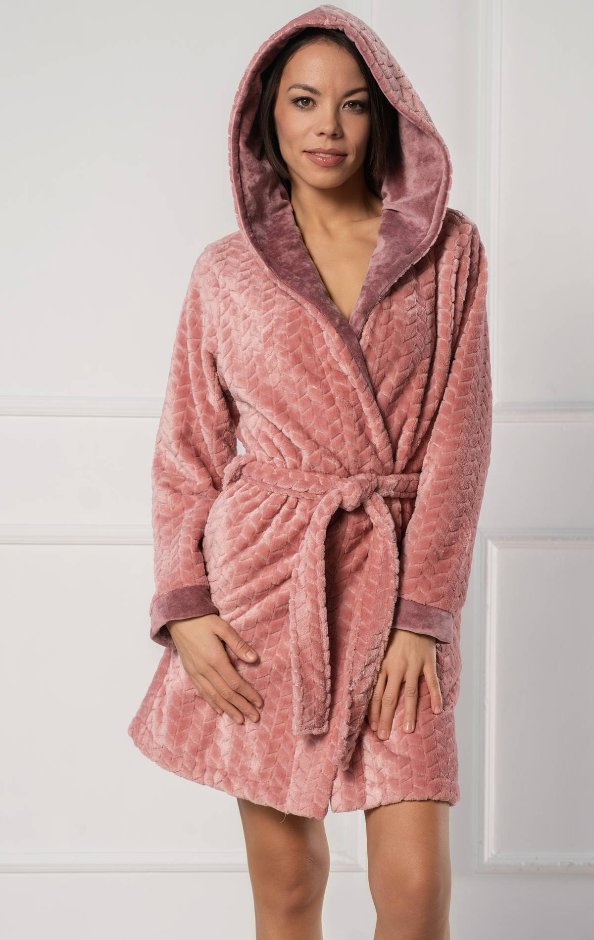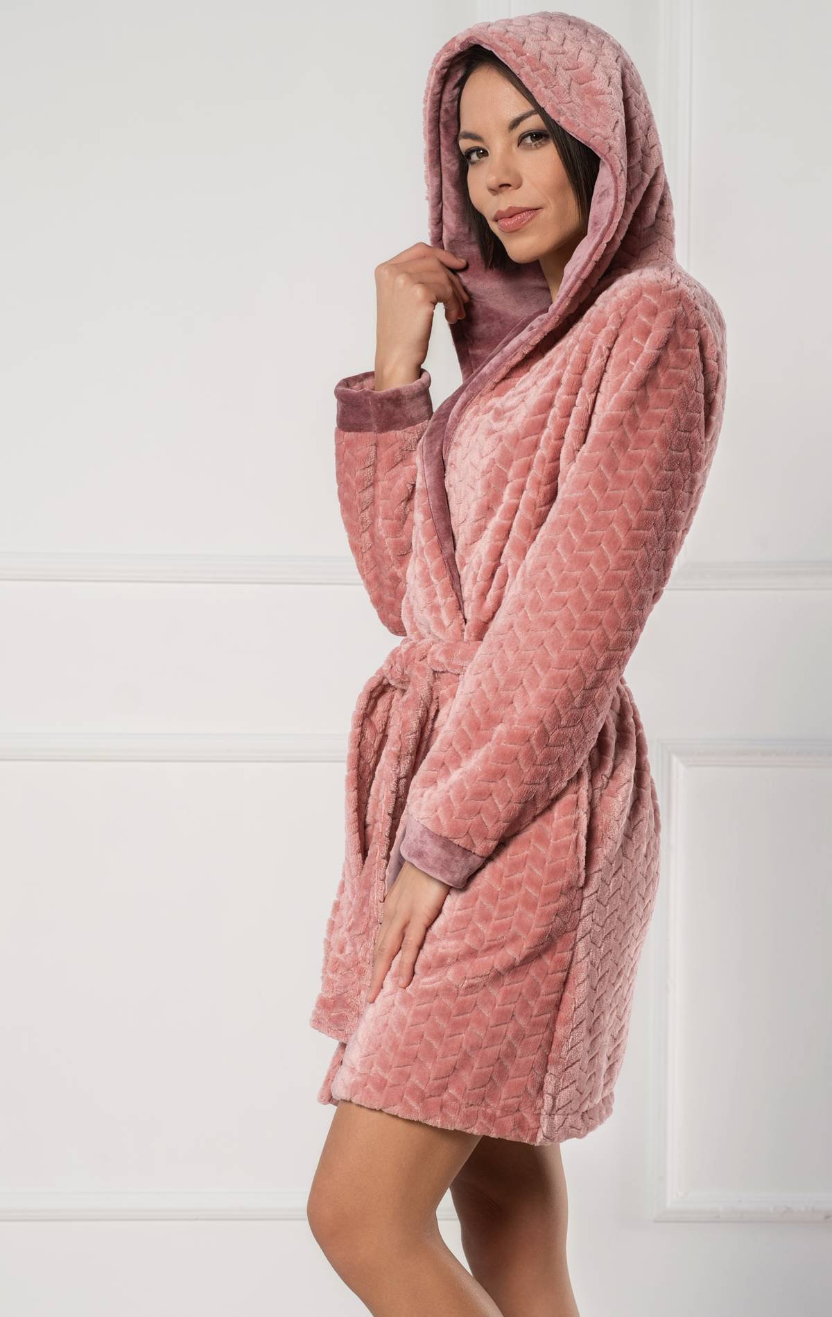 Jaukūs ir prabangūs chalatas su gobtuvu. Minkštas, trumpas, audinys iš poliesterio. Idealiai tinka atsipalaidavimui namuose.