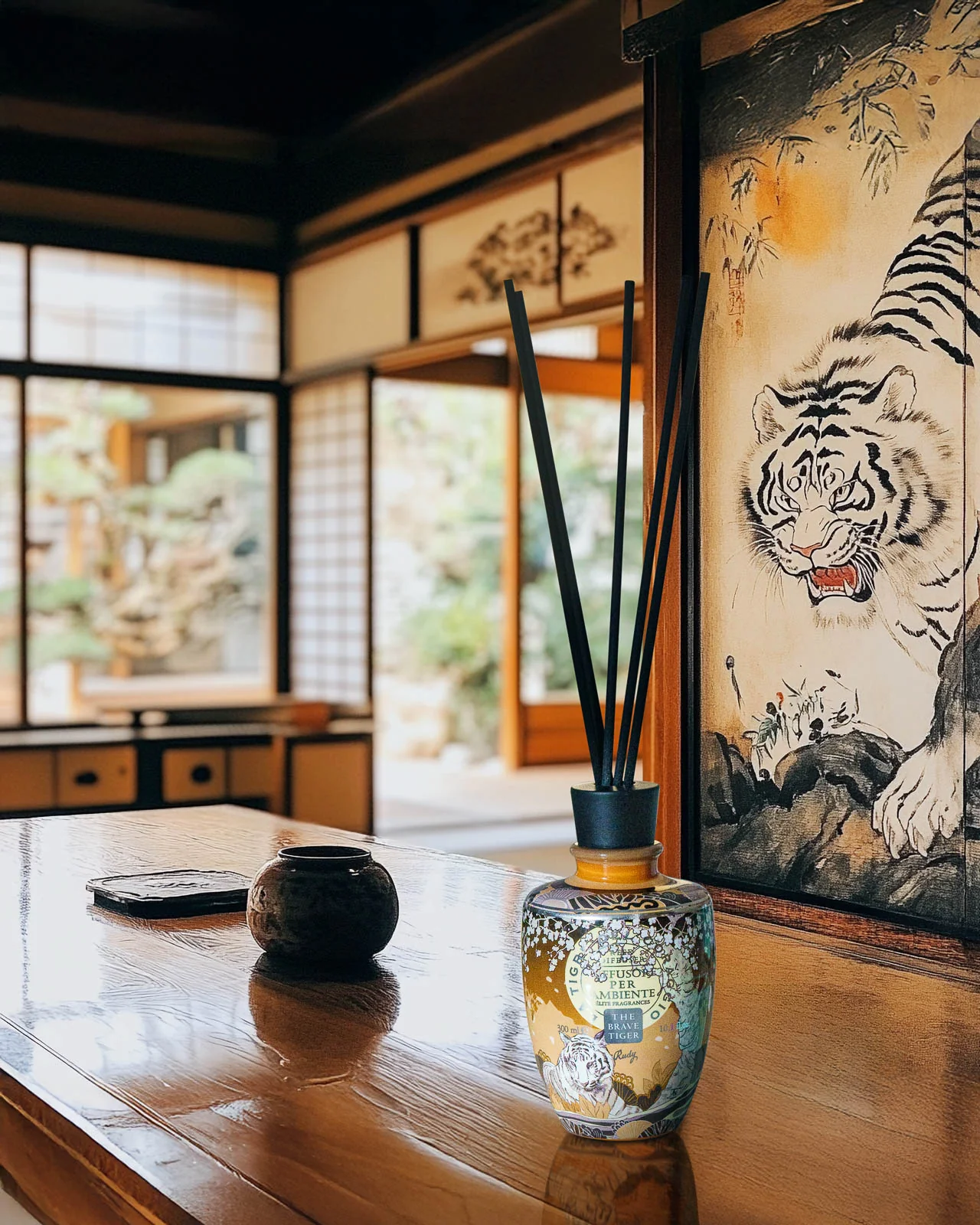 Elegantiškas namų kvapų difuzorius, įkveptas tigro – jėgos ir drąsos simbolio. Aromate dera bergamotė, cinamonas, kašmeranas, tonkos pupelės ir pačiuliai, sukuriantys šiltą, prieskoninį ir ambrišką pojūtį. Tinka visiems, ieškantiems jaukumo, rafinuotumo ir išskirtinės aromatinės atmosferos.